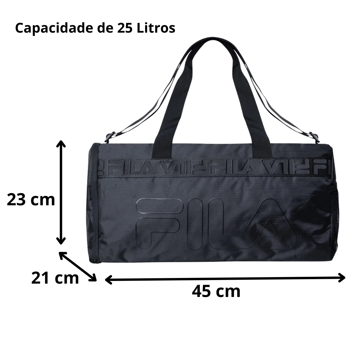 Bolsa Esportiva Unissex Fila Sport Life Outline em 100% poliéster resistente com capacidade de 25 litros. Conta com compartimento principal com zíper bidirecional, compartimento lateral exclusivo para calçados, bolsos em mesh, 2 alças de mão reforçadas e 1 alça de ombro ajustável. Peso aproximado de 480g. Ideal para academia, treinos, viagens curtas e uso diário.