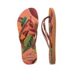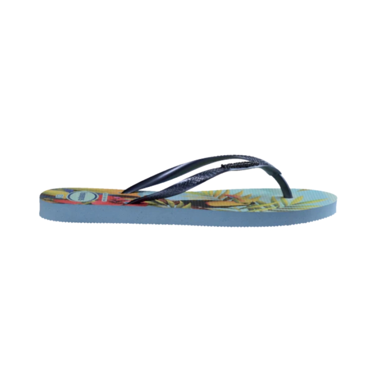 A Havaianas Slim Tropical é a cara do verão brasileiro! Com tiras finas e delicadas, este modelo traz toda a leveza e elegância que conquistam corações há gerações. Sua estampa exclusiva é inspirada na exuberante fauna e flora tropical, com tucanos, cacatuas e elementos da natureza amazônica, representando perfeitamente o espírito alegre e colorido do nosso país.