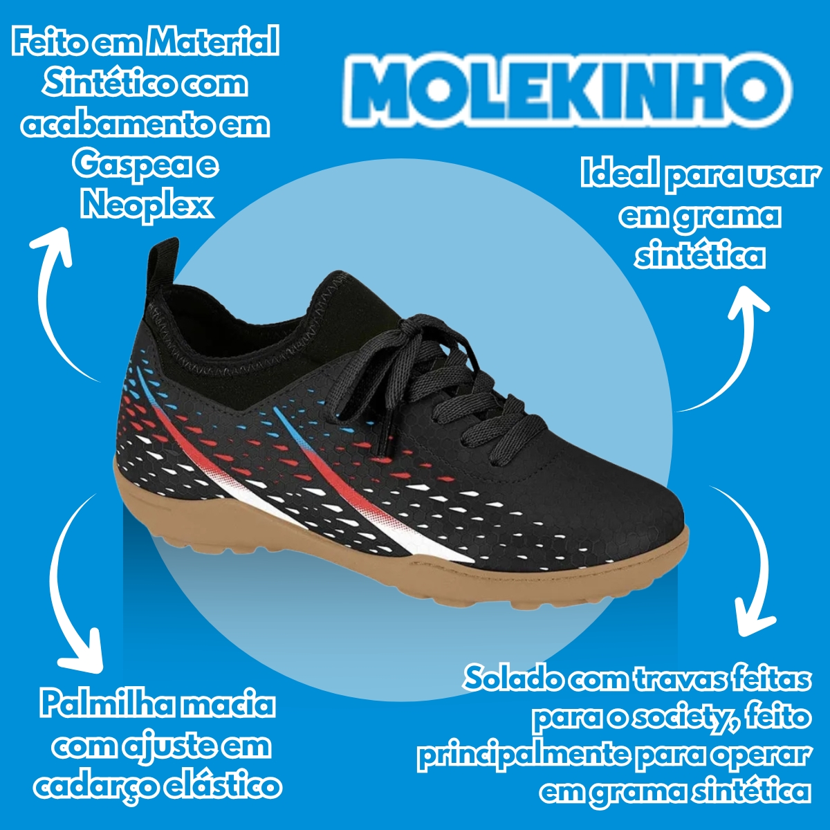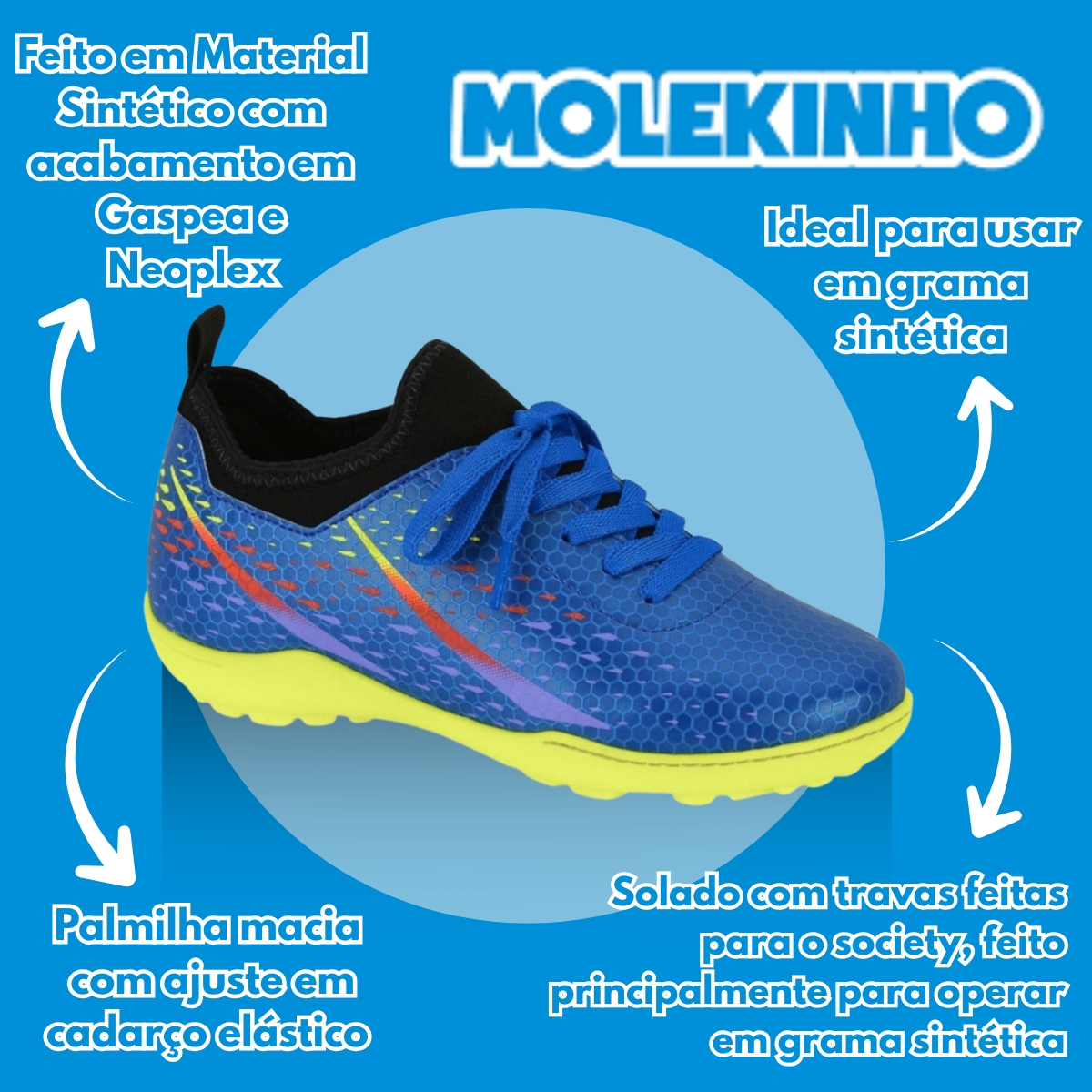 A Chuteira Infantil Society Molekinho oferece conforto, leveza e ótima tração para os pequenos jogarem com segurança e desempenho. Ideal para gramado sintético, garante estabilidade e precisão nos movimentos.