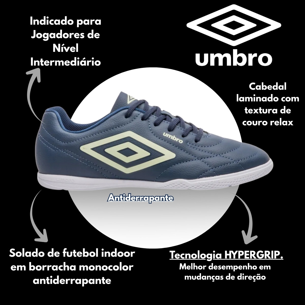 A Chuteira Futsal Umbro Class Footballer é ideal para quem busca conforto e desempenho nas quadras, com cabedal resistente e toque preciso na bola. Conta com palmilha em EVA e solado com tecnologia HYPERGRIP, garantindo amortecimento, aderência e segurança nos movimentos.