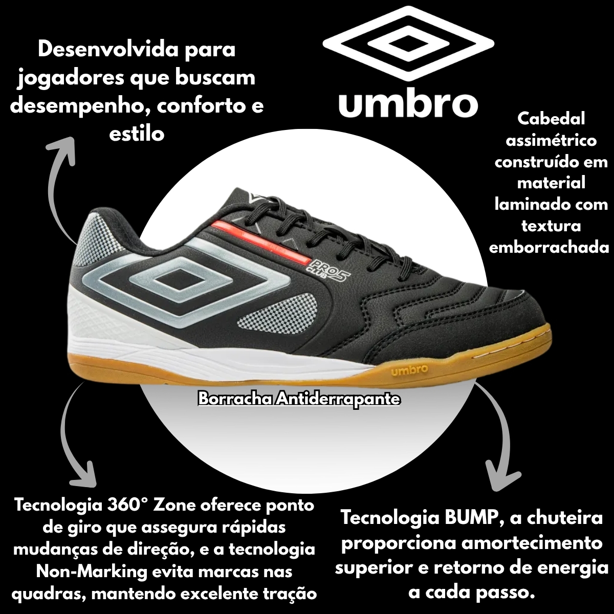 A Chuteira Futsal Umbro Pro 5 Bump Club oferece alto desempenho, conforto e excelente controle nas quadras, com cabedal resistente e tecnologias que garantem amortecimento e estabilidade. Seu solado antiderrapante proporciona ótima tração e segurança em movimentos rápidos.
