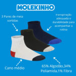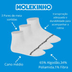 Ideal para o dia a dia, escola e momentos de lazer, o Kit com 3 Pares de Meias Molekinho 2899 oferece conforto, maciez e ajuste seguro, reunindo algodão respirável, cano alto com ponta reforçada e durabilidade em um único conjunto.