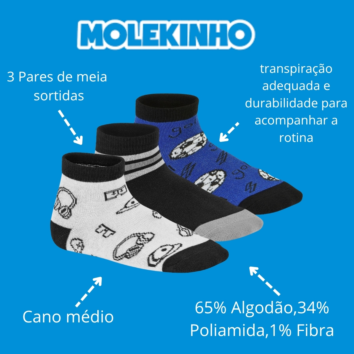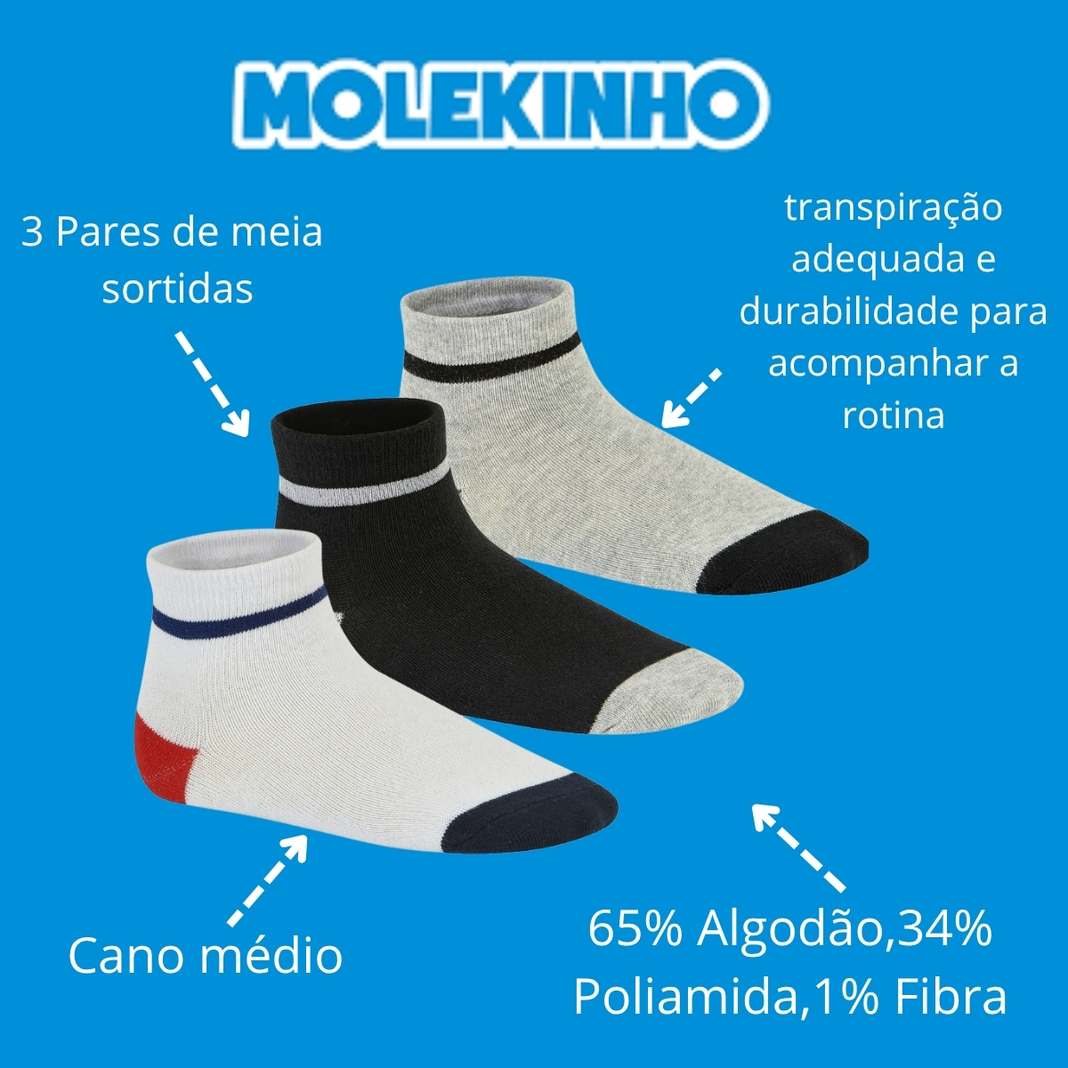 Itens inclusos na compra: Um Kit com 3 Pares de Meias Molekinho Infantil Cano Médio, conforme anunciado, enviado na embalagem original do fabricante.