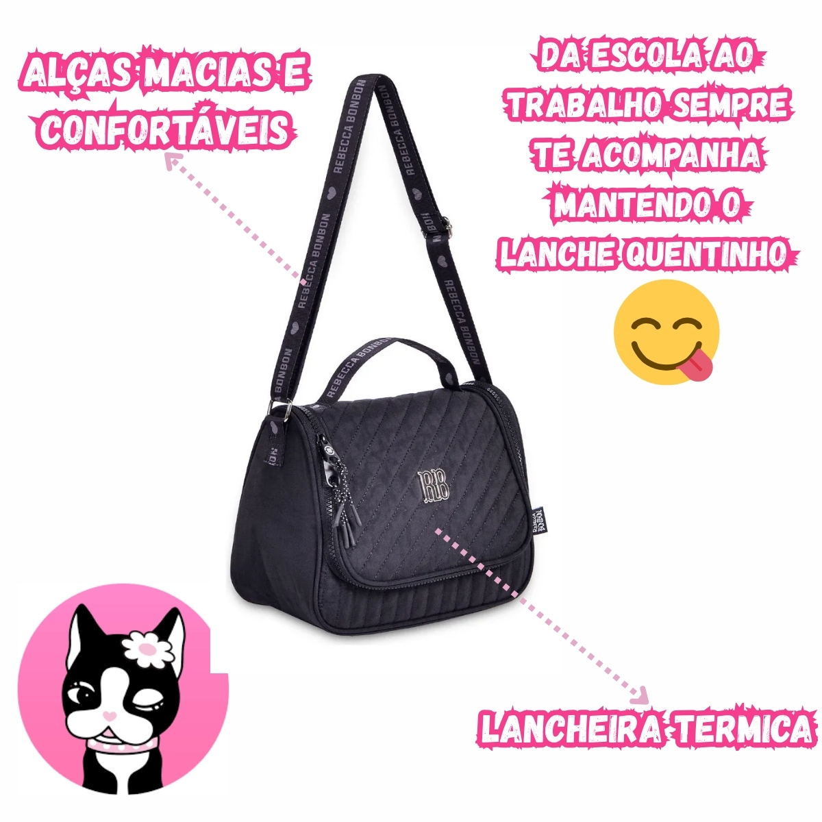 A Lancheira Térmica Rebecca Bonbon RB24520 da Clio foi criada para quem busca funcionalidade sem abrir mão de charme e personalidade. Produzida em poliéster resistente e com acabamento em matelassê, ela traz o visual icônico da personagem Rebecca Bonbon, combinando estilo e praticidade no dia a dia. Seu revestimento térmico mantém os alimentos frescos por mais tempo, tornando o produto ideal para escola, trabalho, passeios, academia e qualquer rotina que exija mobilidade. Além disso, ela pode ser carregada na mão ou na transversal, graças à alça tiracolo ajustável, que garante conforto e versatilidade.