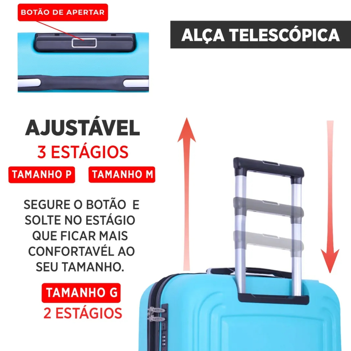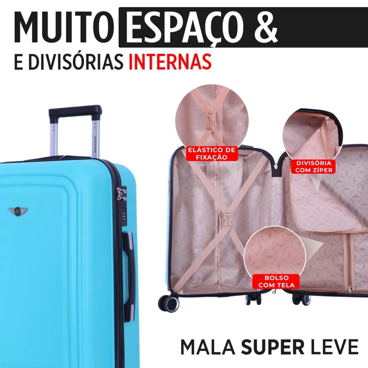 A Mala de Viagem Santino Panteão SDV502M foi desenvolvida para quem busca resistência, praticidade e conforto em suas viagens. Produzida em ABS de alto padrão com acabamento texturizado, garante maior durabilidade e proteção contra impactos, além de um visual moderno e sofisticado. É a escolha ideal para viagens de média duração, oferecendo excelente equilíbrio entre espaço interno e facilidade de transporte. As rodas duplas com giro 360° proporcionam deslocamento suave em qualquer direção, enquanto o puxador retrátil com ajuste de altura, a alça de mão emborrachada e a alça lateral facilitam o manuseio em aeroportos, rodoviárias e hotéis. O cadeado com segredo numérico garante mais segurança durante toda a viagem. Internamente, conta com amplo espaço, bolso telado com fechamento em zíper, divisor com compartimentos e cinta elástica com trava, mantendo os pertences organizados e firmes. Com 24 polegadas, capacidade de 23 kg e dimensões de 67 x 45 x 27 cm, é uma opção robusta e confiável para quem viaja com estilo e segurança.