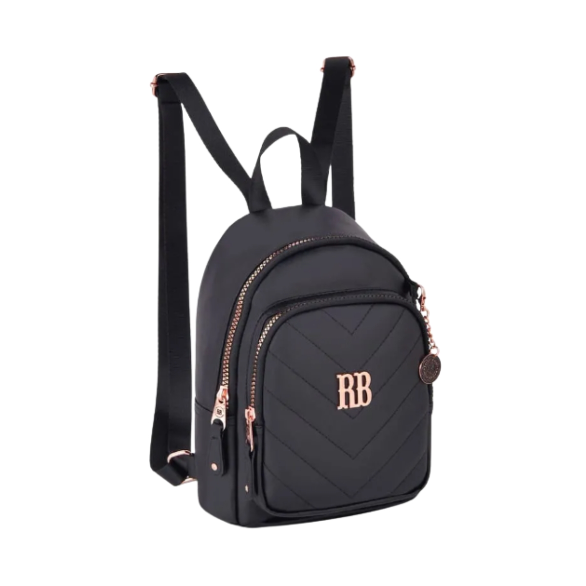 A mini mochila em PVC com aplicação de matelassê, placa RB em metal e acabamentos em rose gold oferece um visual marcante e moderno, ideal para quem ama acessórios diferenciados. O porta fone de ouvido traz organização e proteção para fones Bluetooth, enquanto o chaveiro com pompom e suporte para celular adiciona charme e utilidade ao dia a dia.