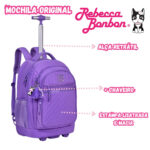 Mochila escolar com rodinhas prática e versátil, podendo ser usada como mochila de costas ou carrinho. Possui compartimento para notebook, bolsos organizadores, rodinhas resistentes e acompanha chaveiro exclusivo Rebecca Bonbon, ideal para o dia a dia escolar.