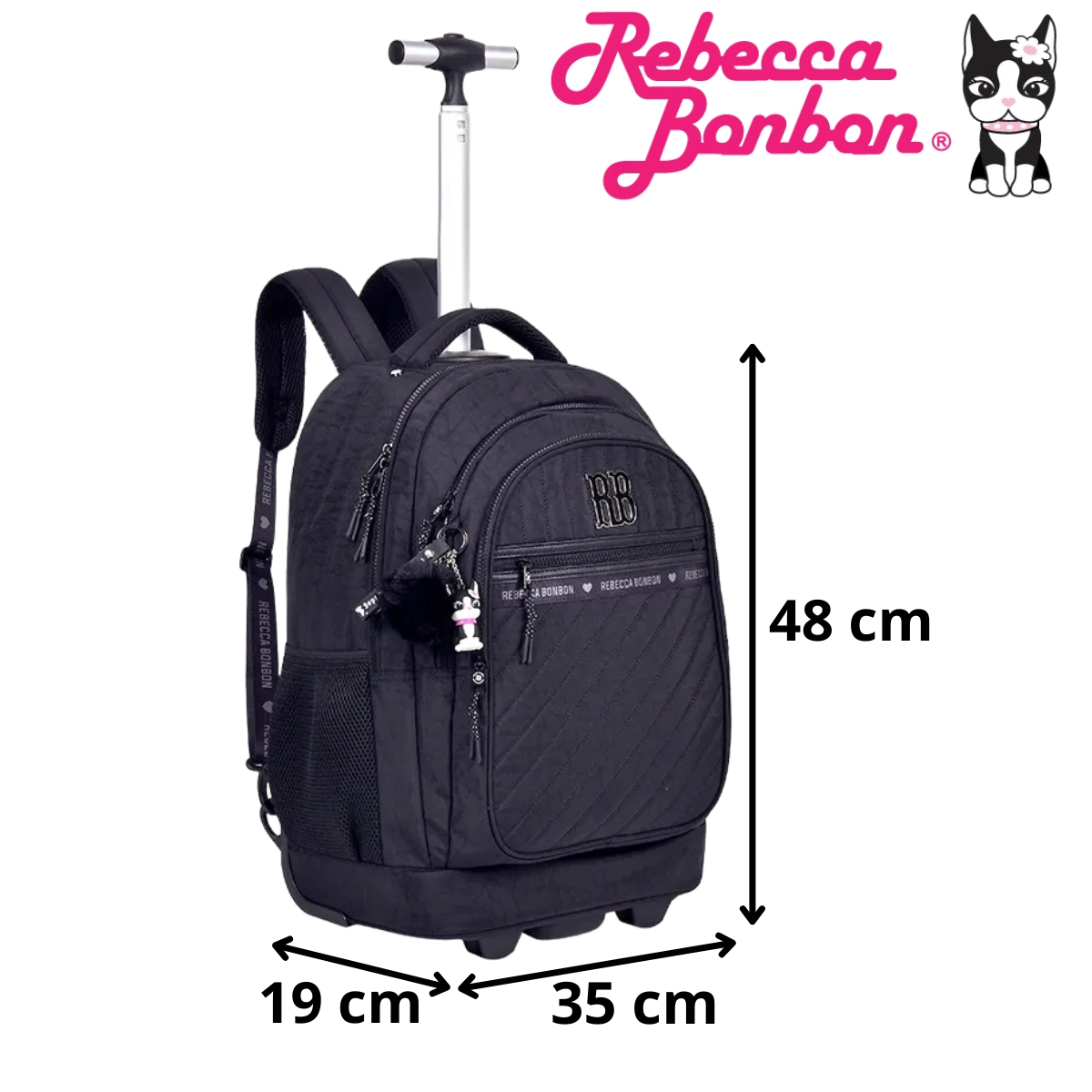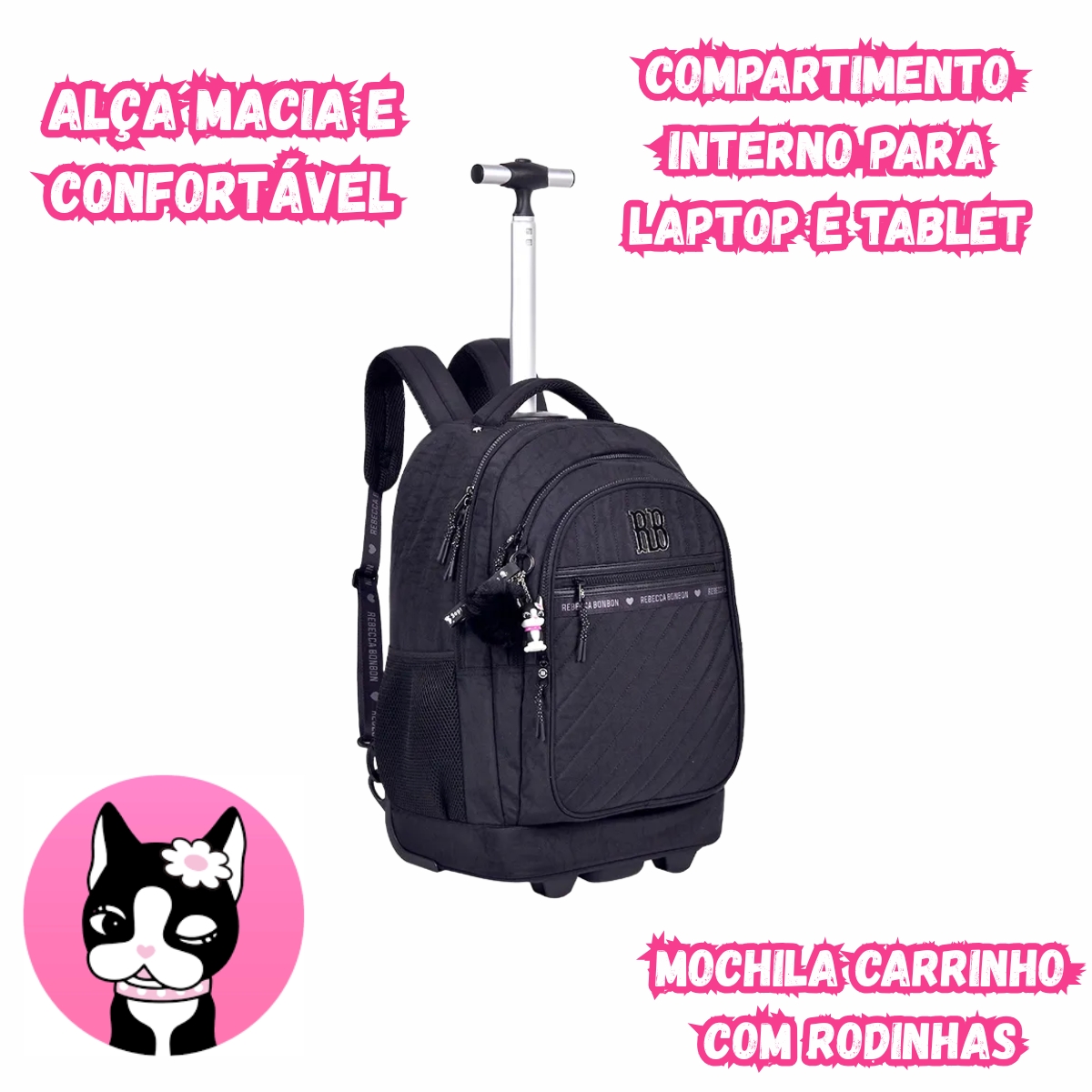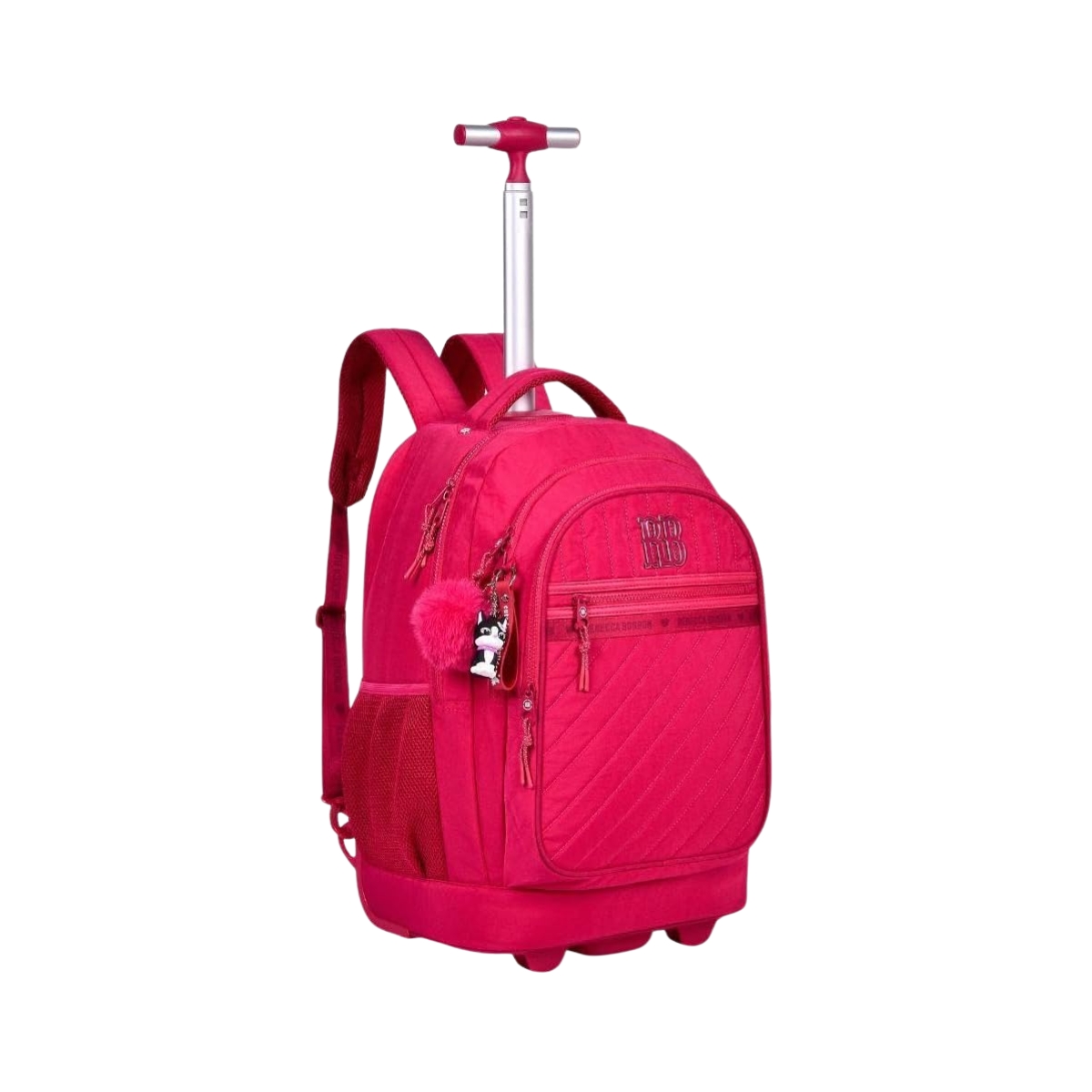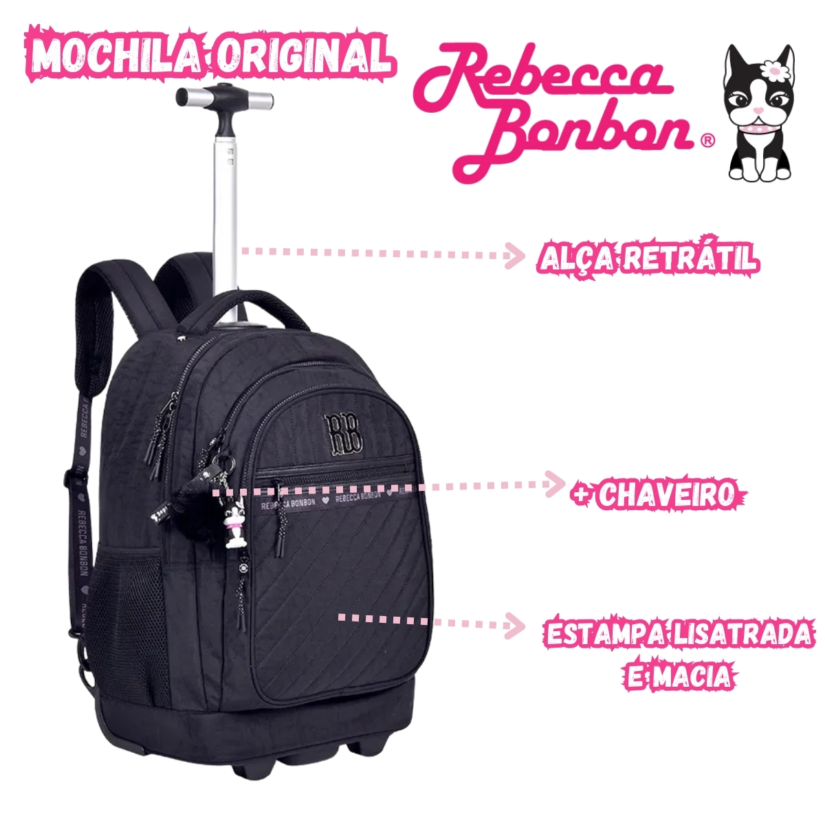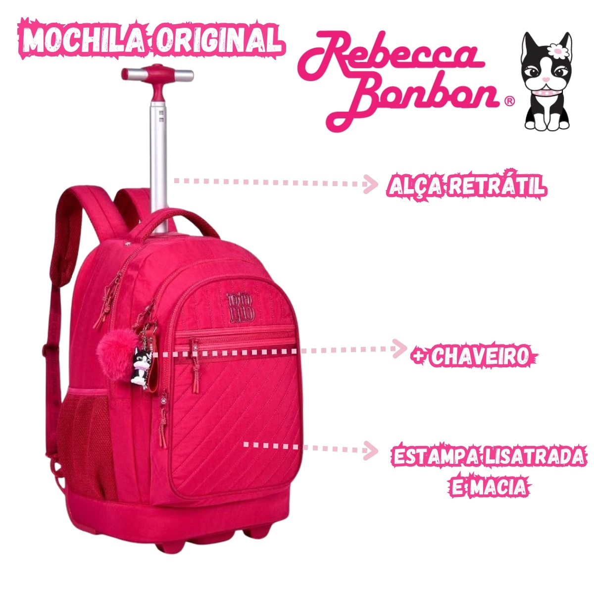 Mochila escolar com rodinhas prática e versátil, podendo ser usada como mochila de costas ou carrinho. Possui compartimento para notebook, bolsos organizadores, rodinhas resistentes e acompanha chaveiro exclusivo Rebecca Bonbon, ideal para o dia a dia escolar.