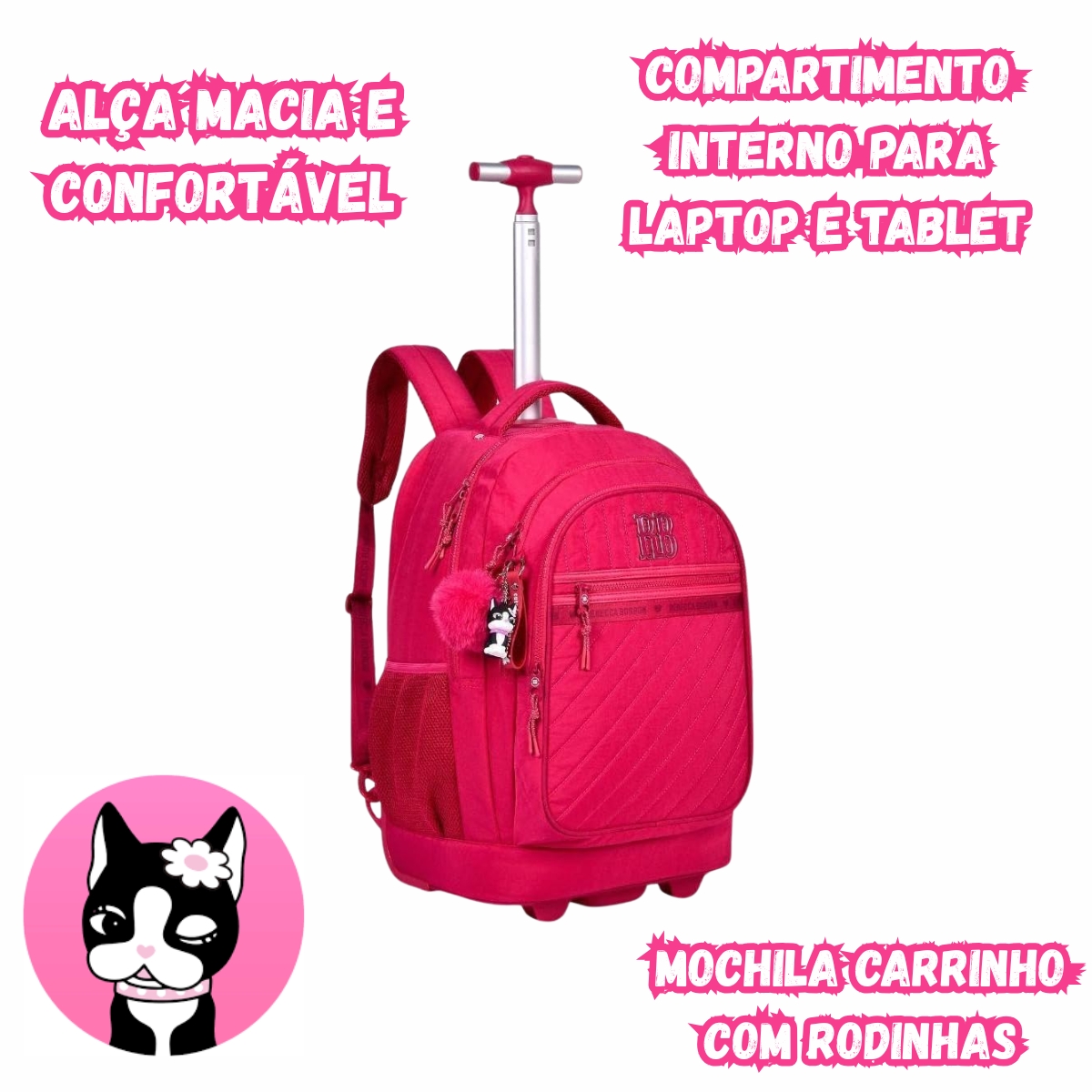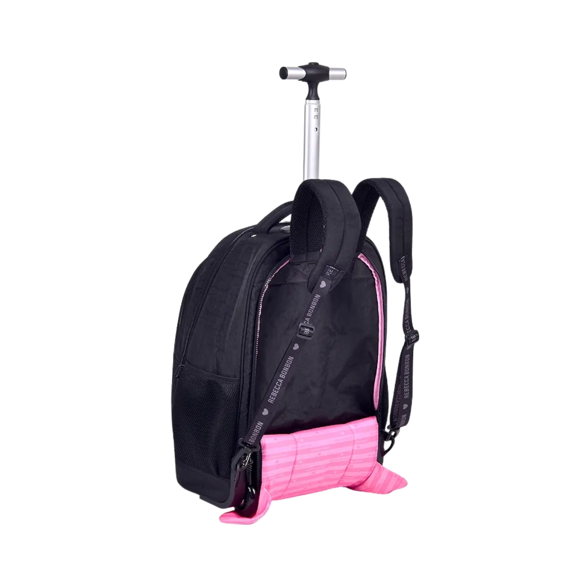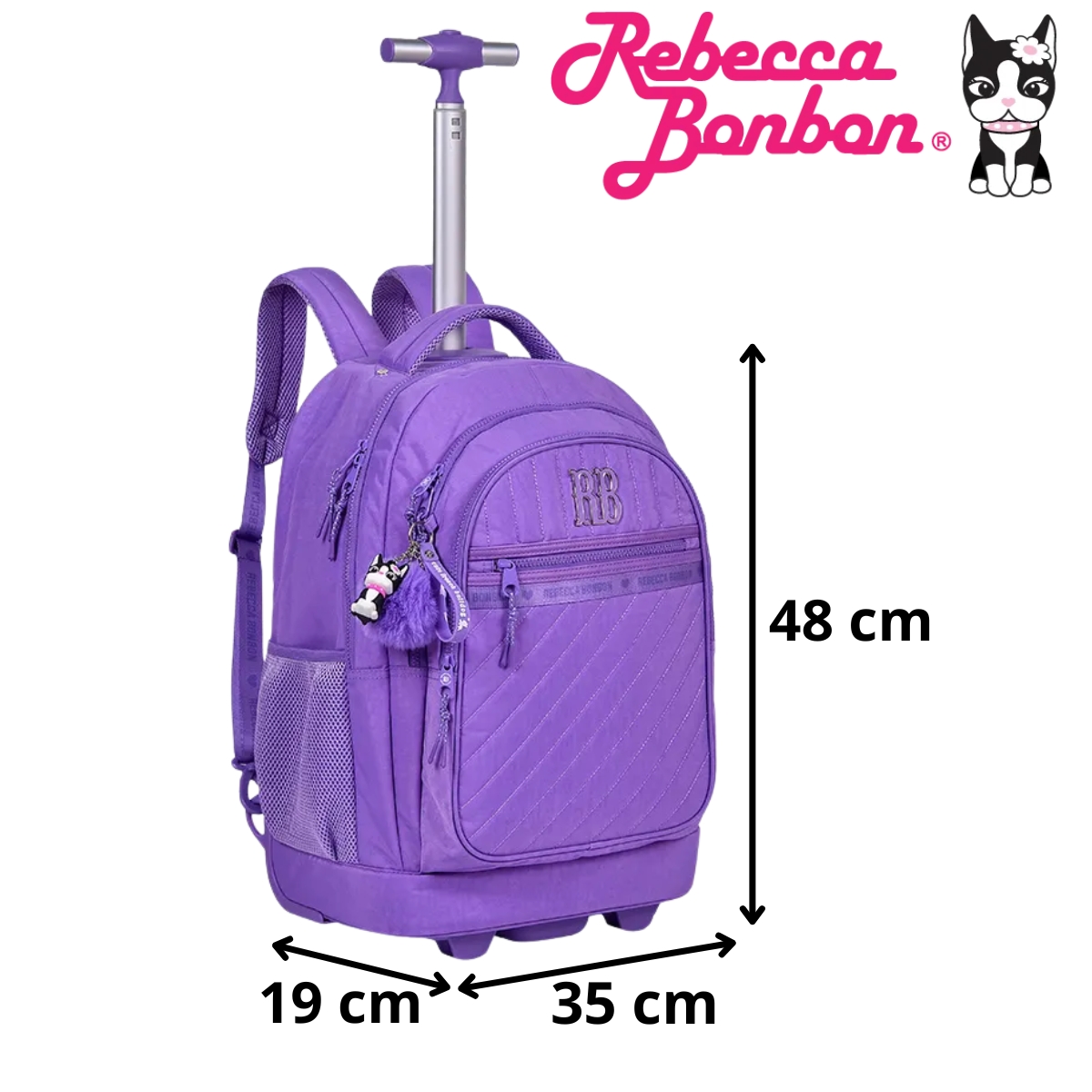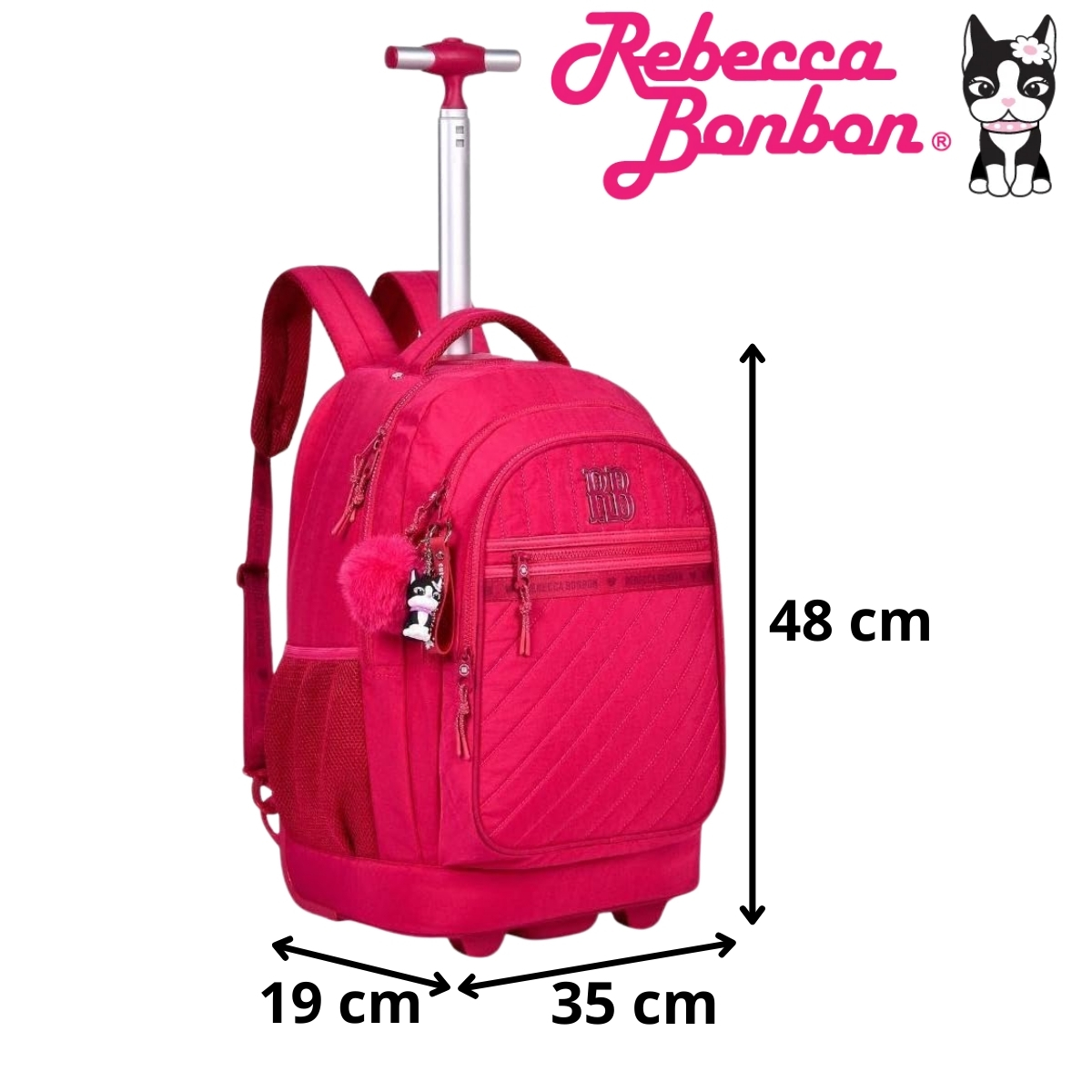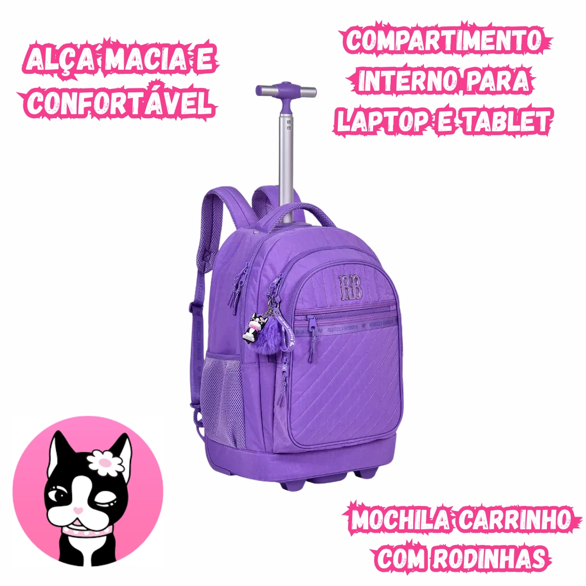 Mochila escolar com rodinhas prática e versátil, podendo ser usada como mochila de costas ou carrinho. Possui compartimento para notebook, bolsos organizadores, rodinhas resistentes e acompanha chaveiro exclusivo Rebecca Bonbon, ideal para o dia a dia escolar.