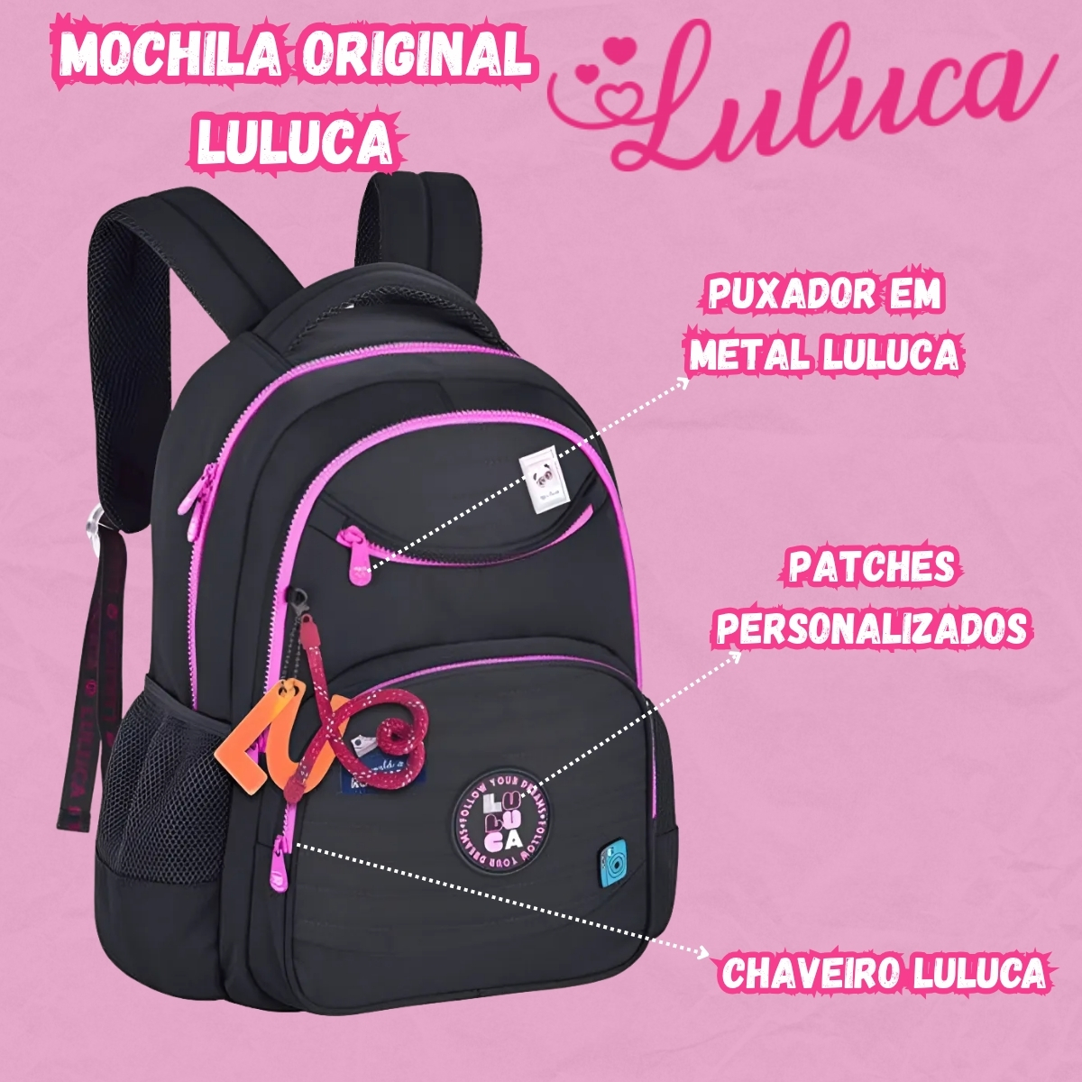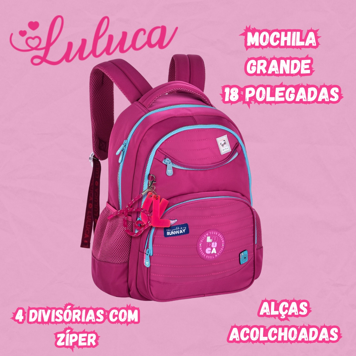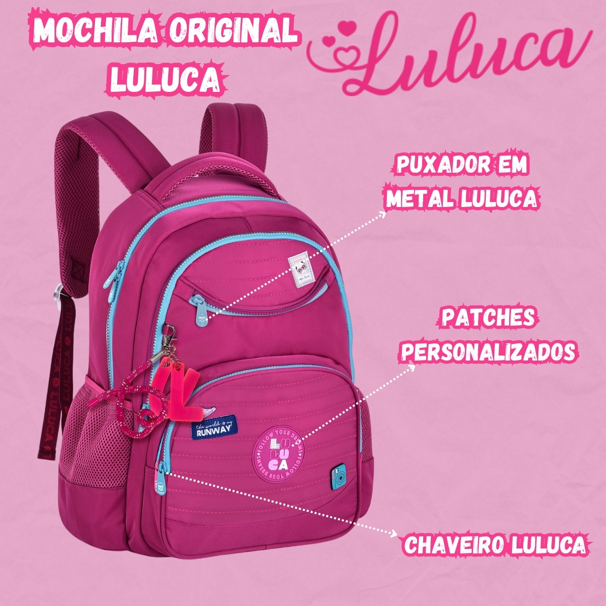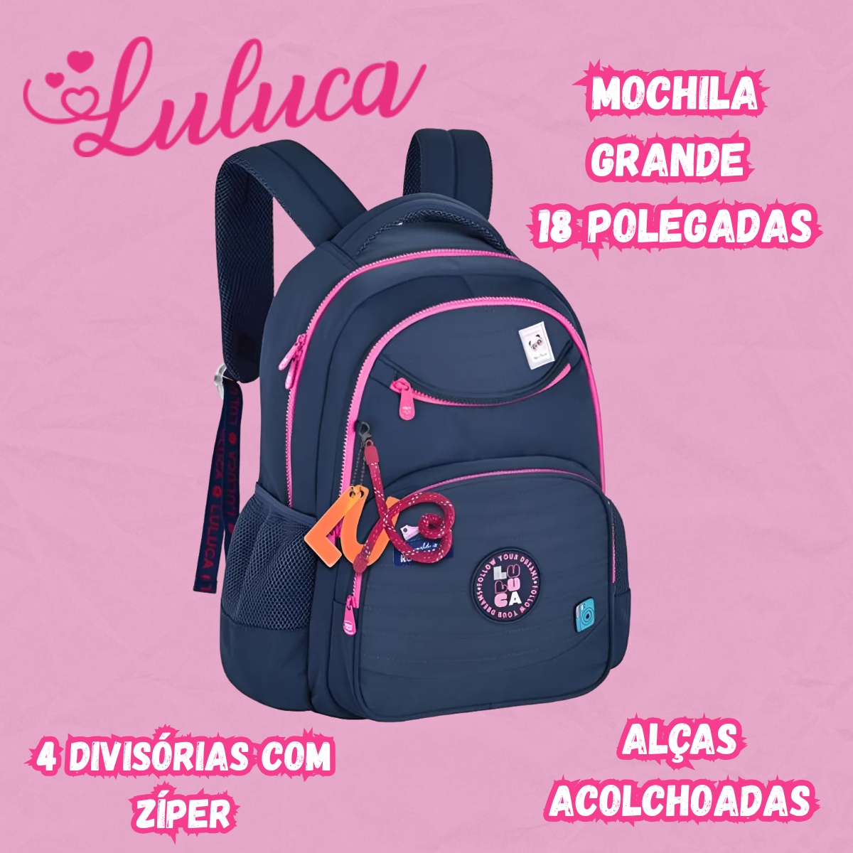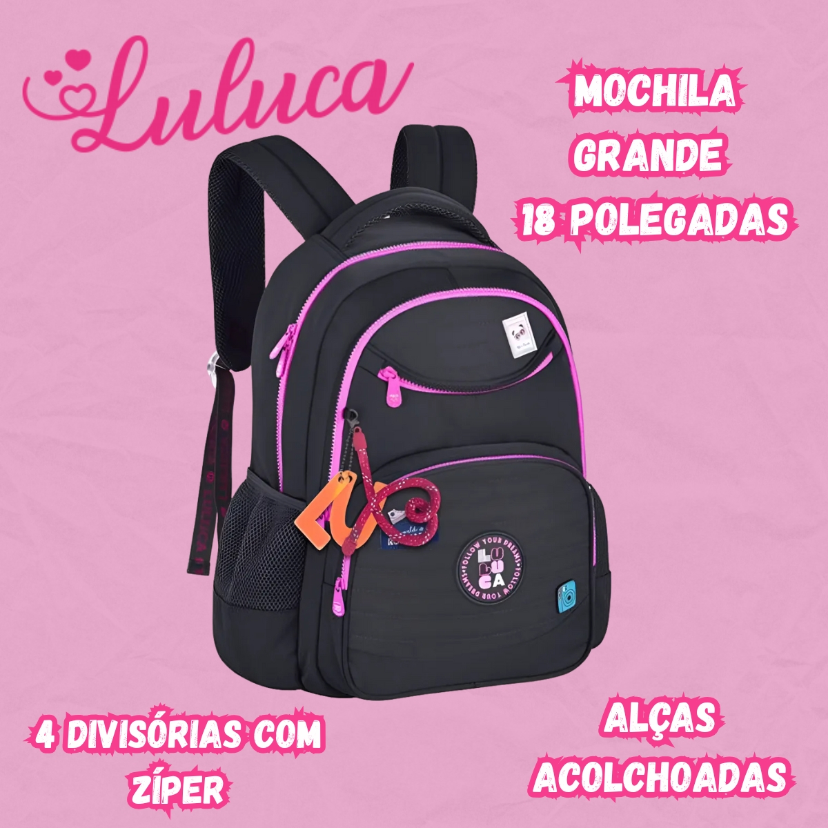 A Mochila Luluca Clio Style LU24635 chega com o visual moderno da coleção 2025, trazendo elementos que combinam tendência, charme e funcionalidade. Seu design em nylon com matelassê, cadarço logado acetinado, pins metálicos e etiquetas em borracha valoriza a personalidade vibrante da influenciadora Luluca, tornando o modelo ideal para a rotina escolar, passeios e atividades diárias.
