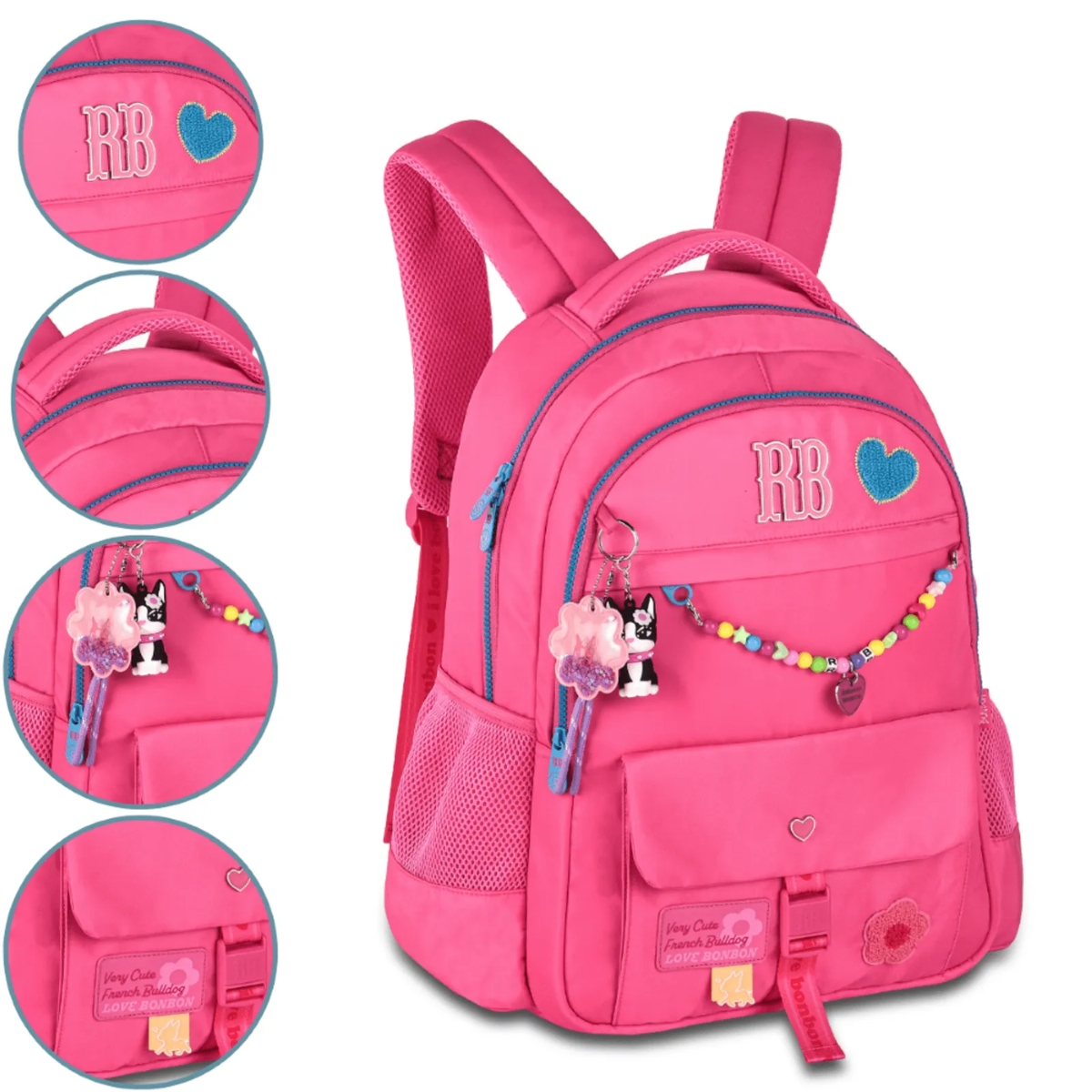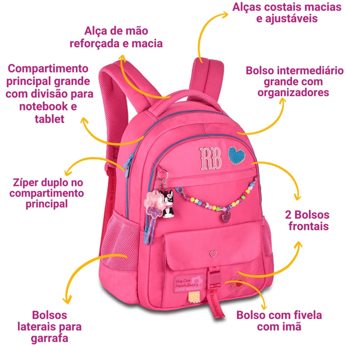 Se você busca a melhor marca de mochilas do Brasil, sua procura termina aqui. A icônica bulldog francesa mais charmosa de Nova York retorna com uma coleção que une glamour, moderno e aquele toque especial que só a Rebecca Bonbon tem. Com materiais resistentes, ótima capacidade interna e detalhes exclusivos, esta mochila foi feita para quem gosta de organização, conforto e muito estilo. Ideal para escola, trabalho e uso diário, entrega durabilidade, versatilidade e um visual apaixonante. Confeccionada em nylon de alta resistência, a peça conta com patches atoalhados, cadarço acetinado, zíper tratorado personalizado e um lindo chaveiro de miçangas com pingente RB. Por dentro, possui compartimentos estratégicos, inclusive para notebook ou tablet, garantindo praticidade total. As costas acolchoadas e alças confortáveis tornam o uso ainda mais agradável ao longo do dia.