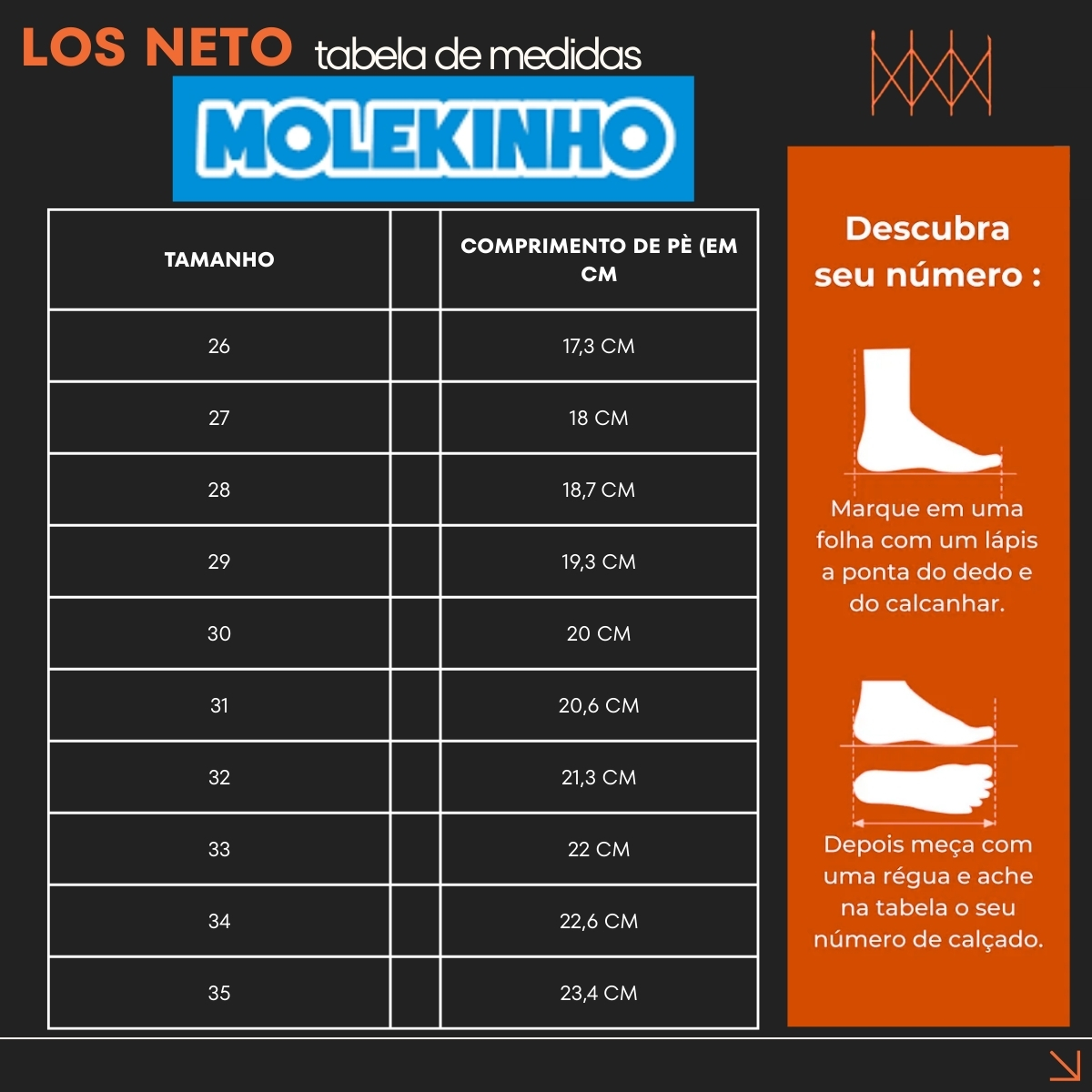 A Sandália Molekinho 2400155 é a pedida certa para os meninos curtirem a primavera/verão com conforto e estilo. O cabedal em Napa Floter é durável e fácil de limpar, as tiras com velcro ajustável garantem ajuste seguro e prático, a palmilha em EVA super macia amortece cada passo e o solado em PVC entrega estabilidade em qualquer superfície.