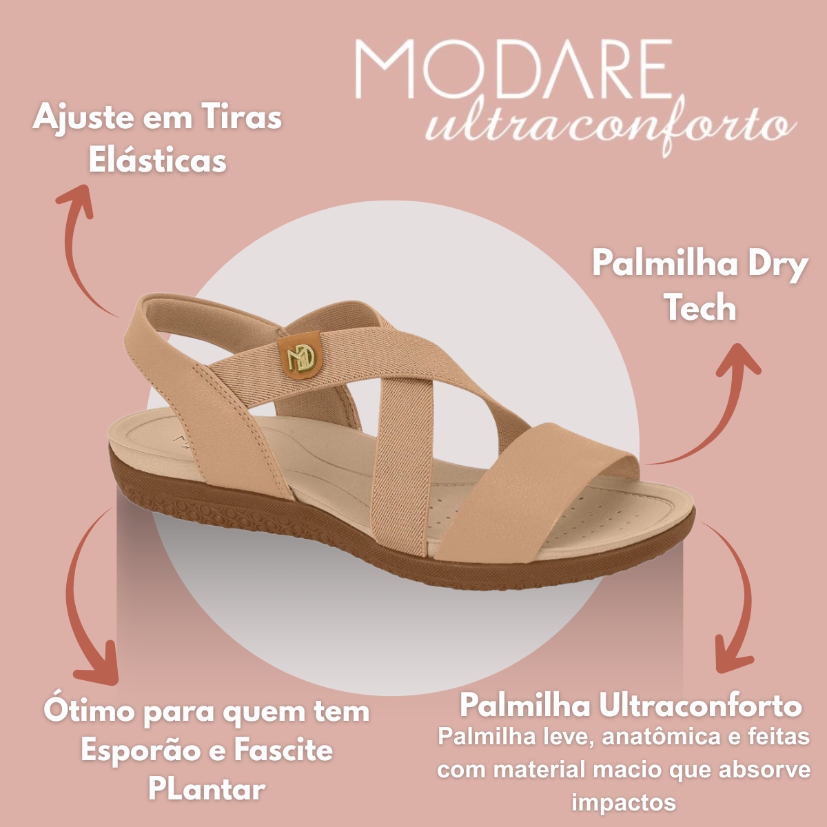 A palmilha Dry Tech garante pés sempre secos e confortáveis, absorvendo a umidade e reduzindo a sensação de calor. O solado anatômico com leve elevação de 2 cm na parte traseira proporciona estabilidade e amortecimento, oferecendo suavidade em cada passo. Pesando aproximadamente 410 gramas o par, a sandália é extremamente leve e ergonômica, ideal para longas jornadas. O design clean na cor nude traz versatilidade e combina com diferentes looks, do casual ao sofisticado.