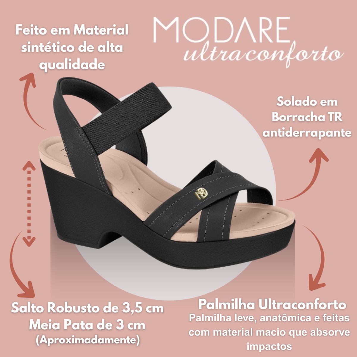 O salto robusto de aproximadamente 6 cm, aliado à meia pata de 3 cm, proporciona maior estabilidade e conforto ao caminhar, reduzindo o impacto e o cansaço. Já o solado em borracha TR antiderrapante oferece segurança, resistência térmica e maior durabilidade. Com design elegante e plataforma moderna, a Modare 7137117 valoriza qualquer look, do casual ao fashion.