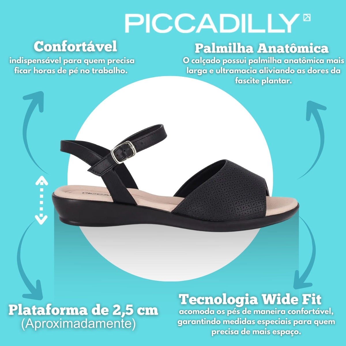 A tecnologia WIDE FIT proporciona um ajuste perfeito, com formas que acomodam melhor os pés e garantem mais espaço e conforto. Produzida com materiais de alta elasticidade, a sandália se molda ao formato dos pés, ajudando a prevenir dores causadas pelo joanete e deixando a região mais discreta. Além disso, conta com palmilha de fácil limpeza, acabamento superconforto, forro superfofinho, super amortecimento e solado em gel supermacio, tornando-se indispensável para rotinas intensas de trabalho. Um modelo versátil que adiciona modernidade e bem-estar a qualquer look.