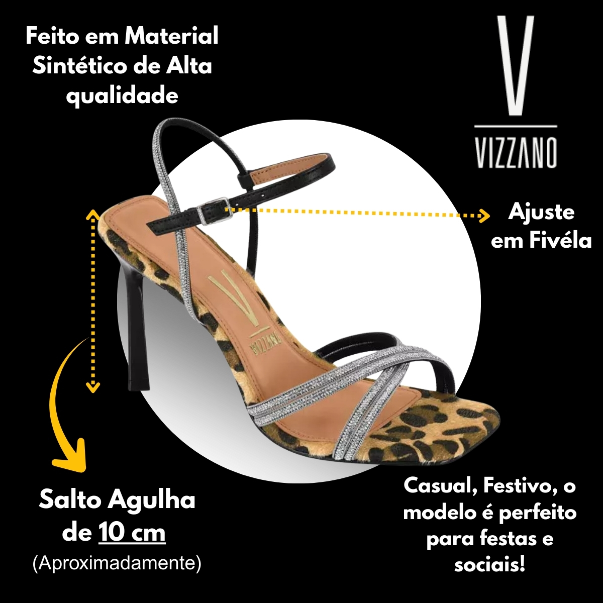 A Sandália Feminina Vizzano 6516.408 combina elegância e atitude com estampa animal print de onça e tiras com strass. Possui salto agulha alto, palmilha macia e fechamento em fivela ajustável, garantindo conforto e estilo para festas, eventos e produções marcantes.