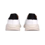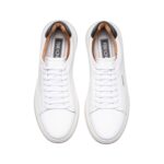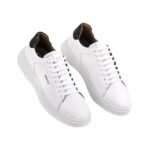 Confeccionado em couro legítimo de alta qualidade, o modelo oferece excelente durabilidade e um acabamento premium. Seu cabedal branco, com pequeno logo na lateral, proporciona um visual limpo e refinado, enquanto o recorte traseiro em cor contrastante adiciona um toque contemporâneo ao design.