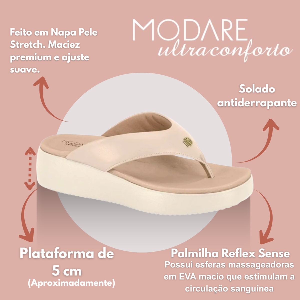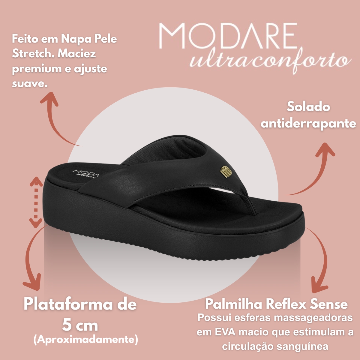 Confeccionado em Napa Pele Stretch de alta qualidade, proporciona resistência e toque macio, enquanto a palmilha em EVA ultramacio com relevos massageadores garante uma experiência de bem-estar única, ativando a circulação sanguínea a cada uso. O solado de borracha antiderrapante aumenta a segurança, trazendo firmeza e estabilidade ao caminhar.