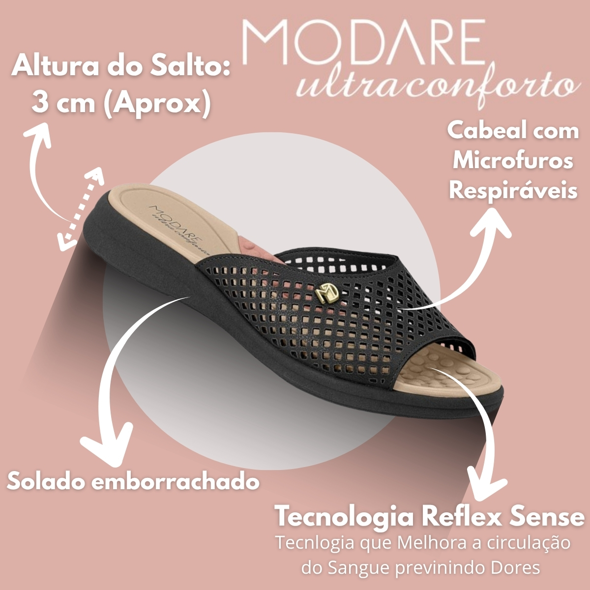 Confeccionado em material sintético de alta qualidade, o cabedal apresenta cortes a laser que adicionam charme e delicadeza ao visual. A palmilha conta com a tecnologia ReflexSense, composta por esferas em EVA que massageiam os pés a cada passo, estimulando a circulação sanguínea e proporcionando relaxamento prolongado.