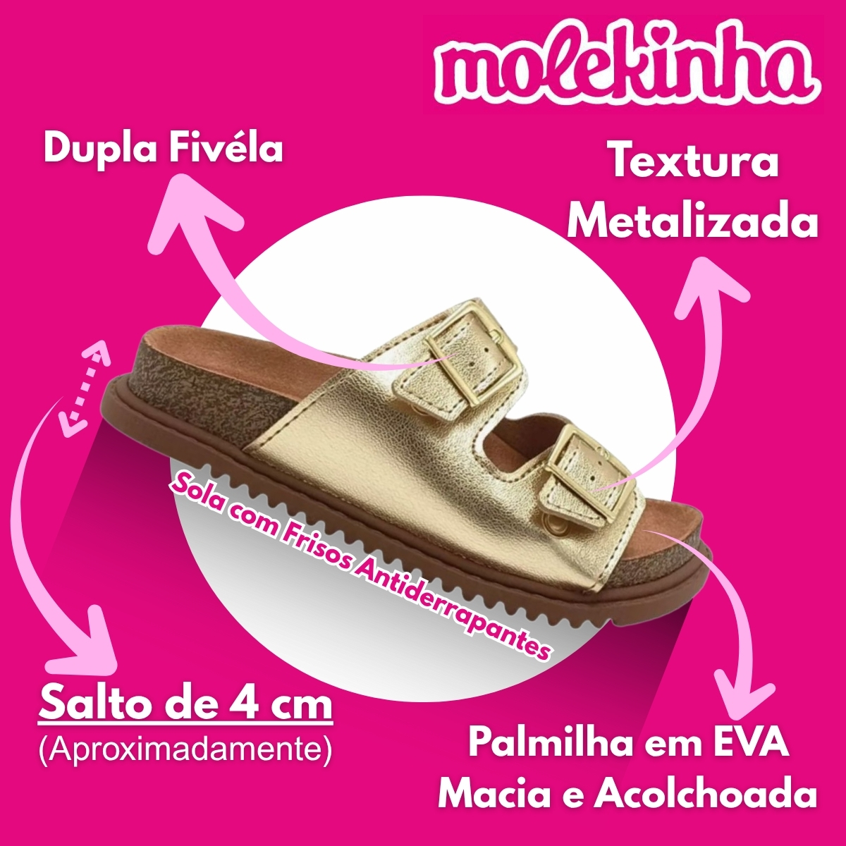 Itens inclusos na compra: Um Tamanco Infantil Molekinha Dupla Fivela 2357103, enviado na caixa original do fabricante.