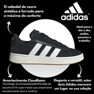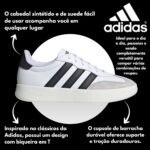 A palmilha macia contribui para maior bem-estar ao caminhar, enquanto o solado de borracha oferece boa aderência, estabilidade e segurança em diferentes superfícies. A combinação de cores Cloud White, Core Black e Grey One reforça a identidade clássica da adidas, trazendo sofisticação e facilidade na hora de compor o look.