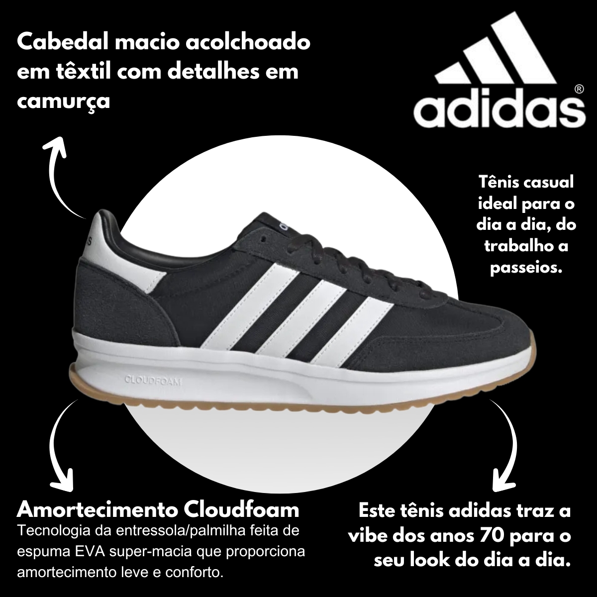Com o visual clássico nas cores Core Black / Cloud White / Cloud White, este tênis é a escolha perfeita para quem busca versatilidade, estilo e conforto em um único modelo.