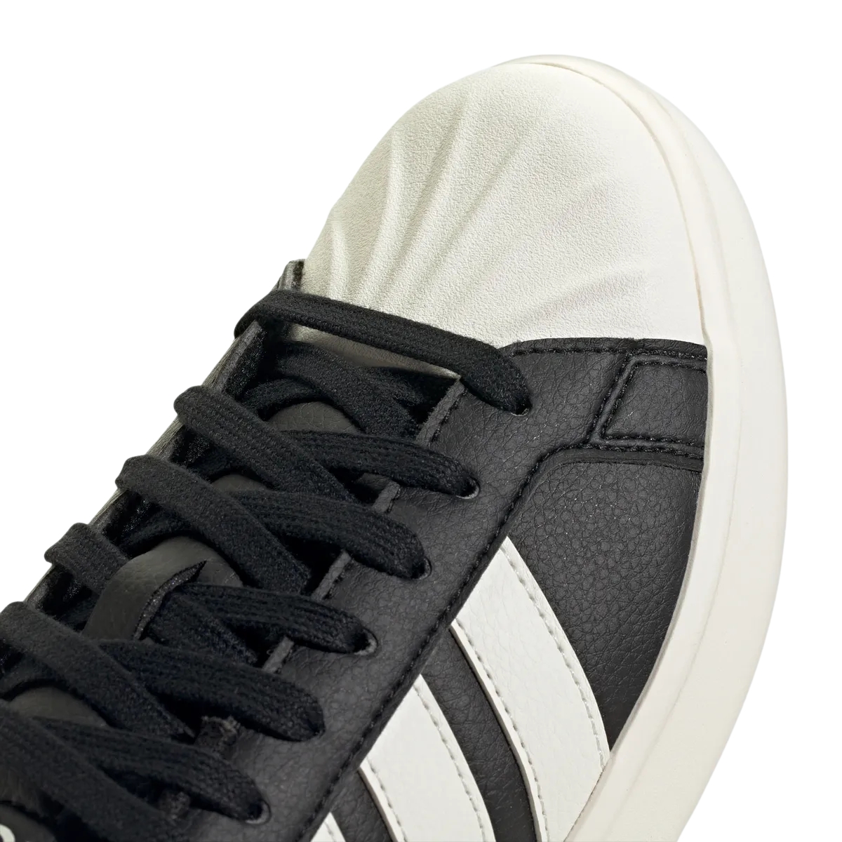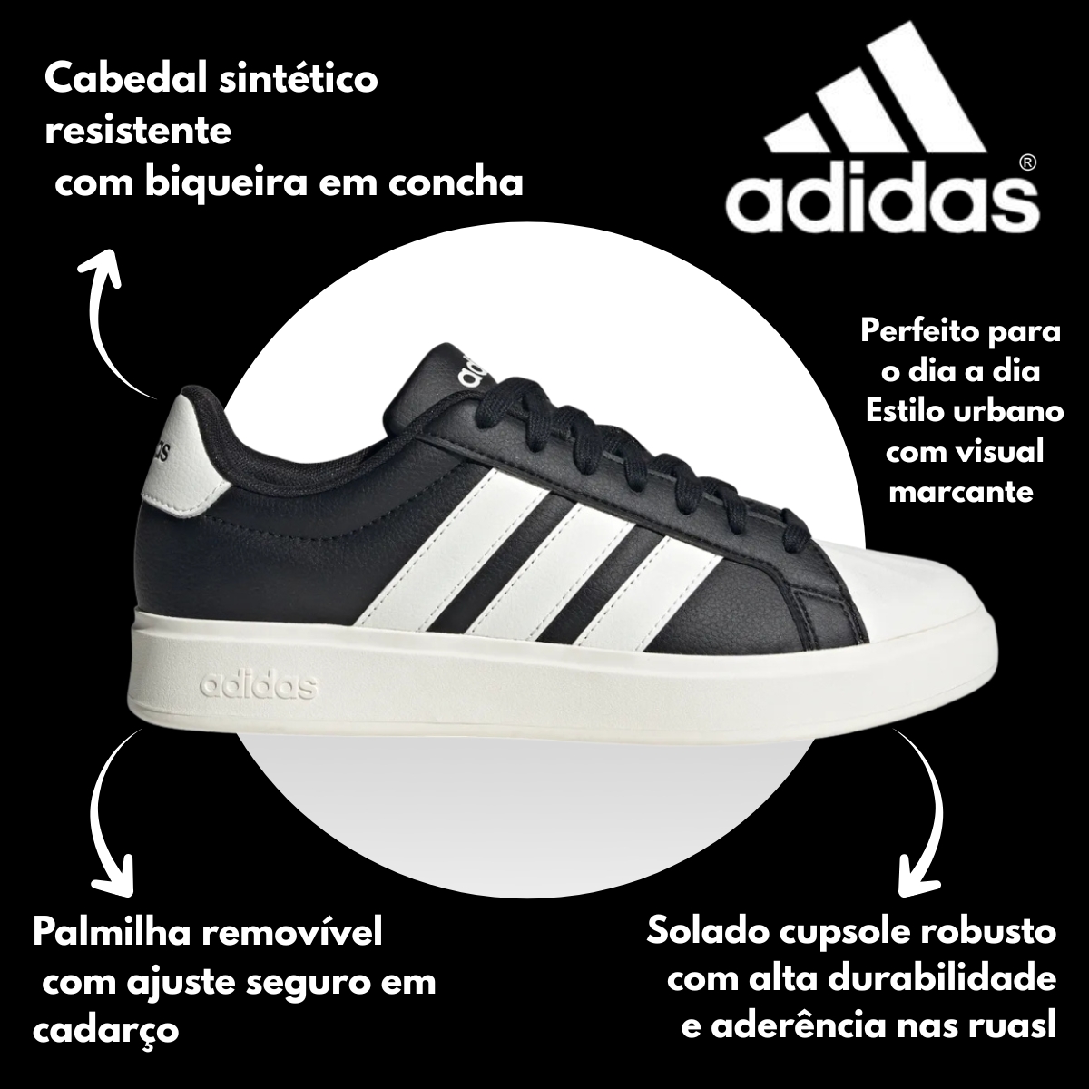 O grande destaque fica por conta da biqueira em concha, elemento icônico dos arquivos adidas, que reforça o estilo clássico reinterpretado de forma atual. O cabedal em couro sintético oferece durabilidade e fácil manutenção, enquanto o forro têxtil garante conforto durante todo o uso.