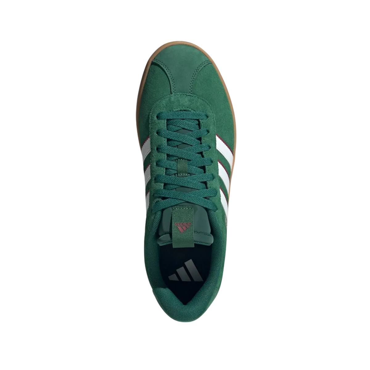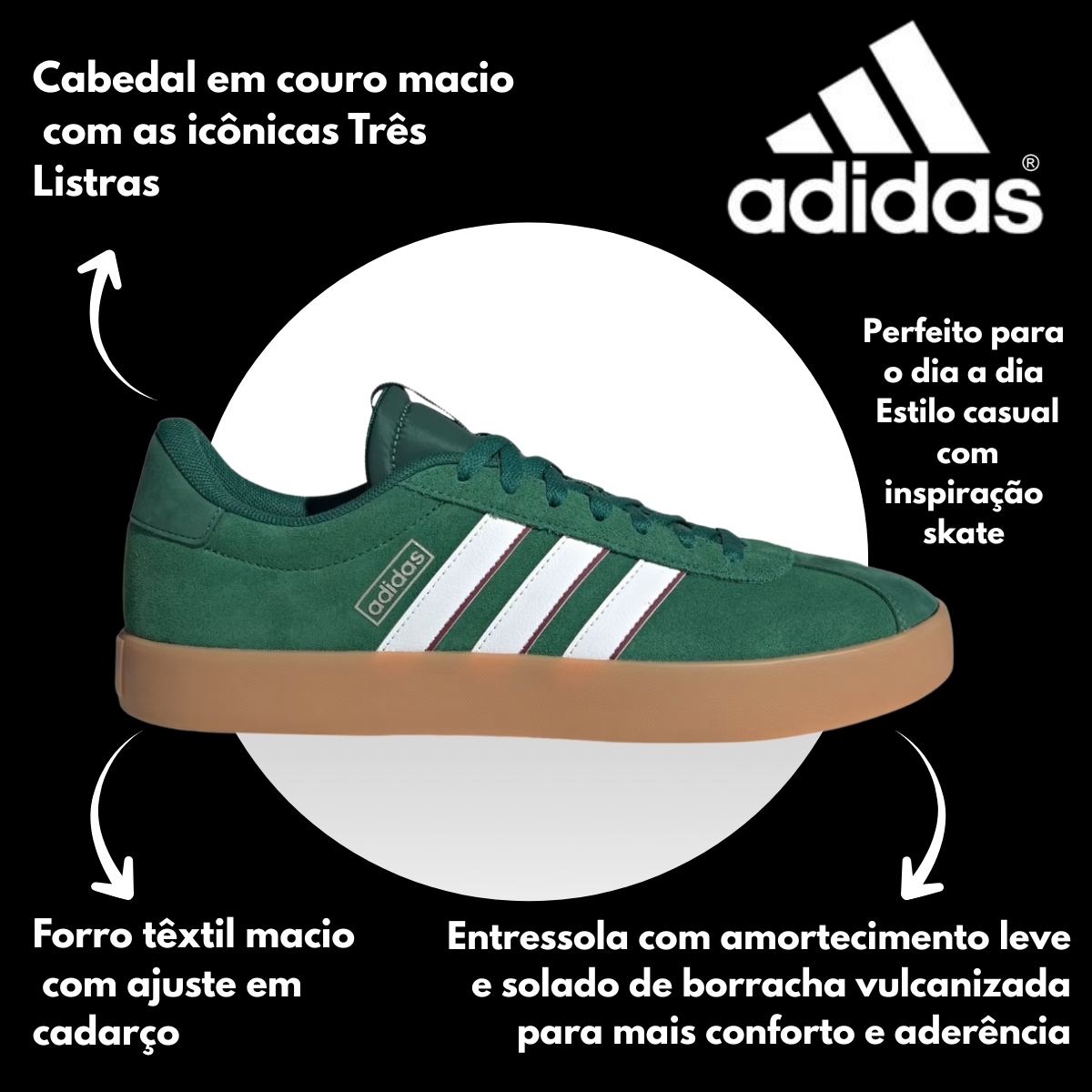 O solado de borracha vulcanizada, inspirado nas pistas de skate, entrega excelente tração, aderência e resistência ao desgaste, tornando o modelo perfeito para aventuras urbanas, passeios e momentos de lazer. A combinação de cores Dark Green, Cloud White e Collegiate Burgundy reforça o estilo marcante e original característico da adidas.