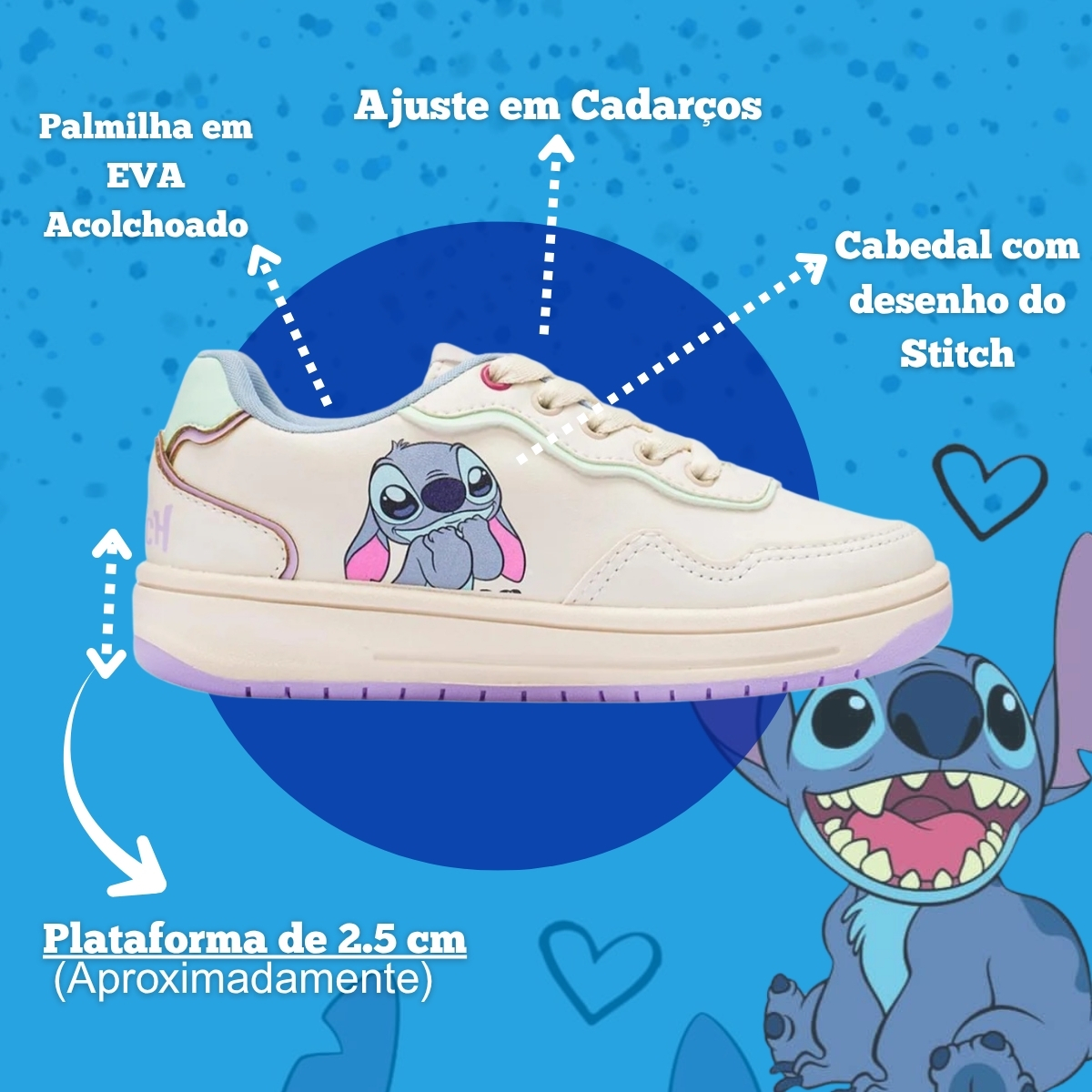 O Tênis Infantil Disney Stitch é a escolha ideal para trazer leveza, conforto e diversão ao dia a dia das pequenas aventureiras. Produzido em material têxtil macio, ele oferece flexibilidade e liberdade de movimento, mantendo os pezinhos confortáveis durante cada passo.