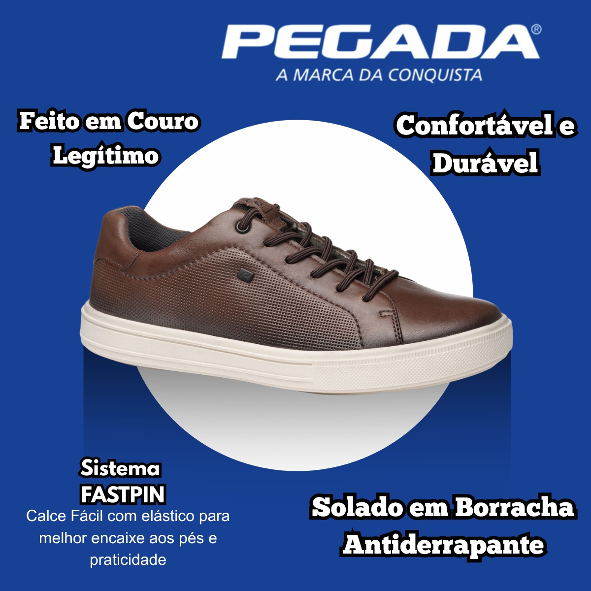 O Sapatênis Pegada 111501-03 em couro legítimo tabaco combina conforto, praticidade e estilo para o dia a dia. Com sistema Fast Pin de calce fácil, palmilha macia e solado leve em PU, oferece ajuste rápido, estabilidade e versatilidade para trabalho ou momentos casuais.